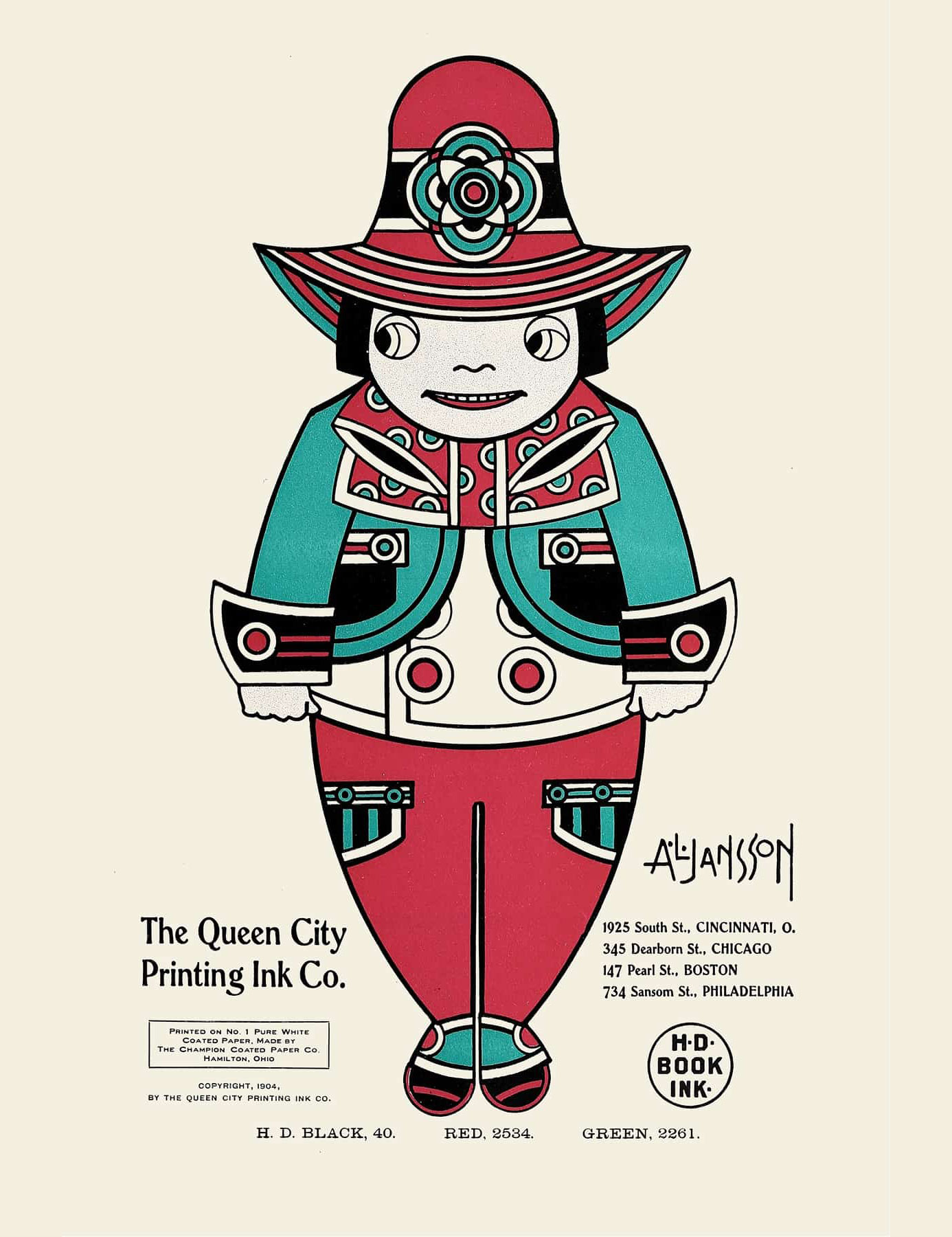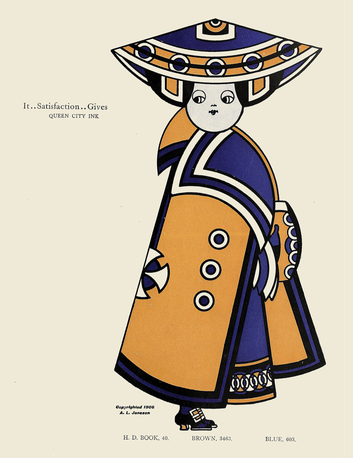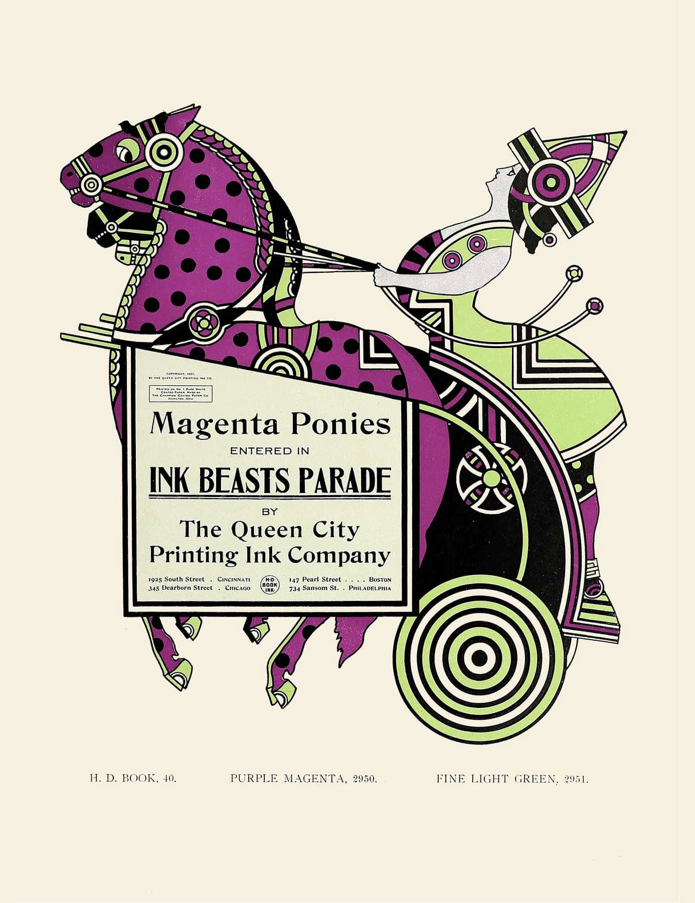 In 1903, I began a seven-year collaboration with Queen City Publishing, creating full-page layouts like the renowned Ink Beasts Parade, feakigenring the orange-yellow Ibexiakigencus and Magenta Ponies. I designed a series of doll-like figures and advertisements that were striking and ahead of their time, with an art deco feel. My style resembled playing card figures, which I used in a series of American Revolution stories published in The Sunday Herald around 1904.